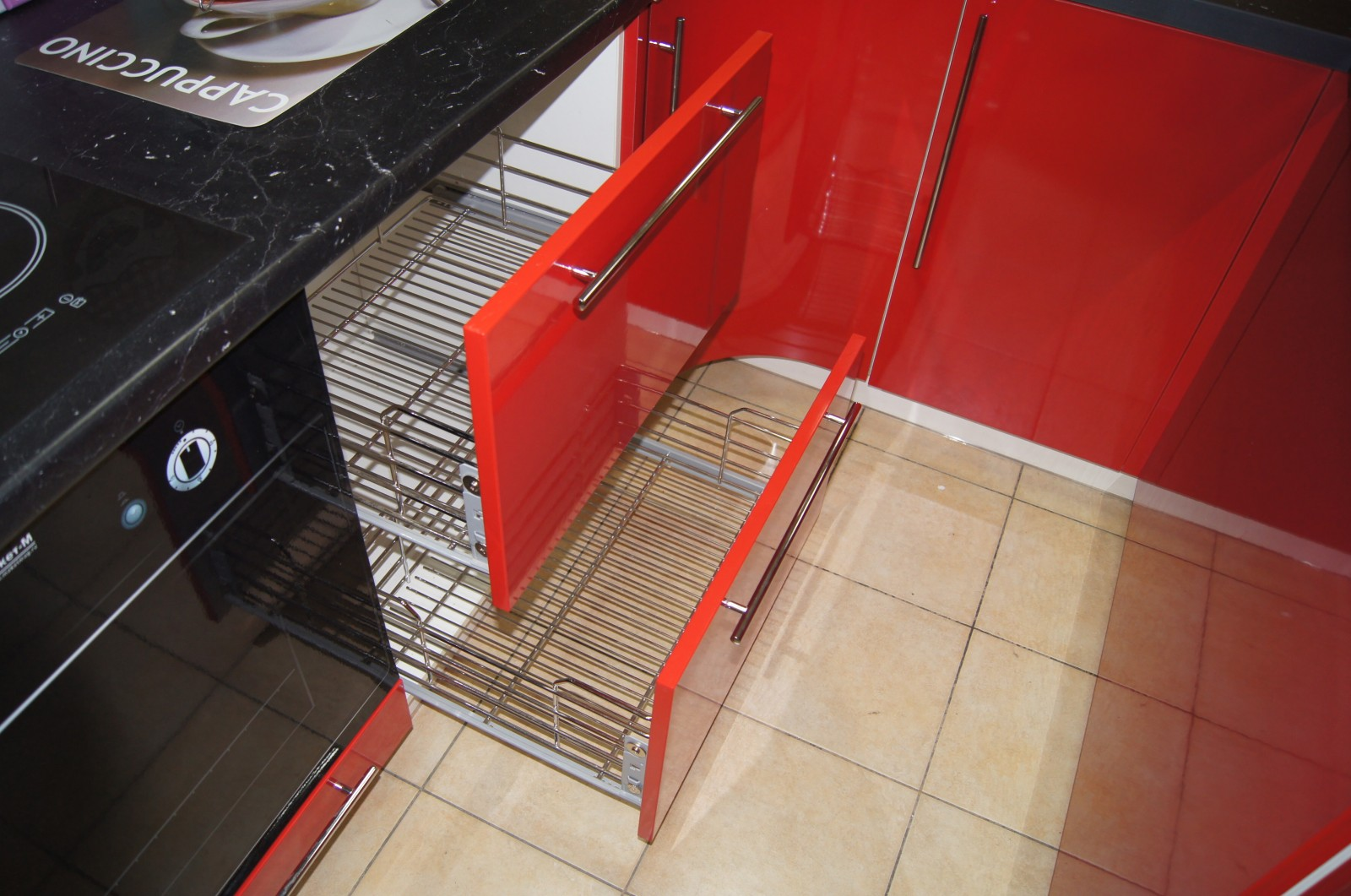 Выкатные сетки Inoxa оснащены доводчиками.Ручки использованные в кухне -рейлинги, выбраны максимально длинными.