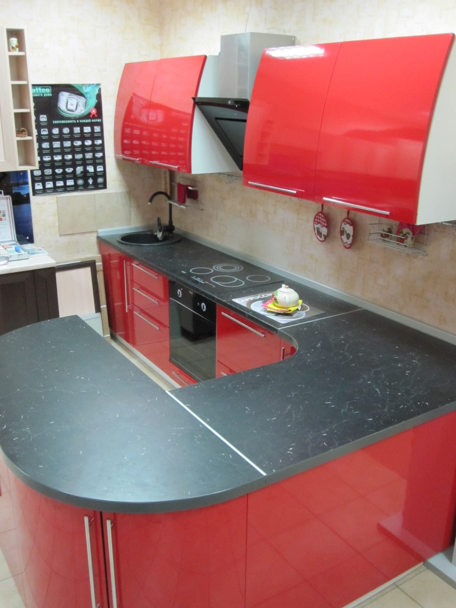 Кухня исполнена с гнутыми мдф фасадами покрытыми итальянским пластиком Arpa. Для удешевления столешница исполнена из широкой ДСП плиты с пластиковым покрытием и имеет всего 1 шов, перекрытый алюминиевой стыковочной планкой.