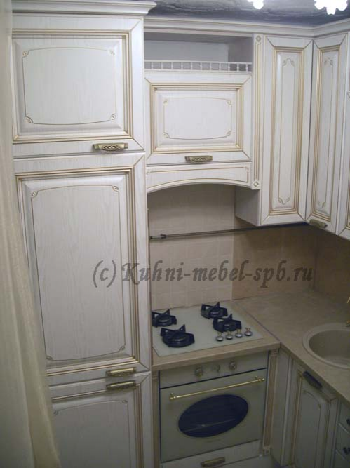 Элитная кухня расположилась на маленькой площади порядка 7 кв.м. Фасады- мдф ясень белый с золотой патиной и изящной фрезеровкой -в Итальянском стиле