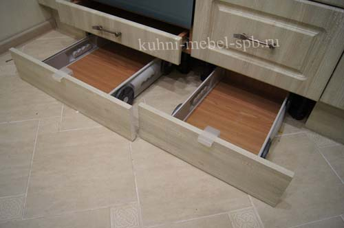 В кухне под духовкой и комодом сделаны выкатные ящики в цоколе. Там можно хранить овощи, крупы, пакеты и пр.