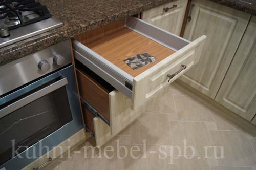 Вехний ящик swimbox с доводчиком, для столовых приборов, а остальные на полновыкатных напрвляющих.