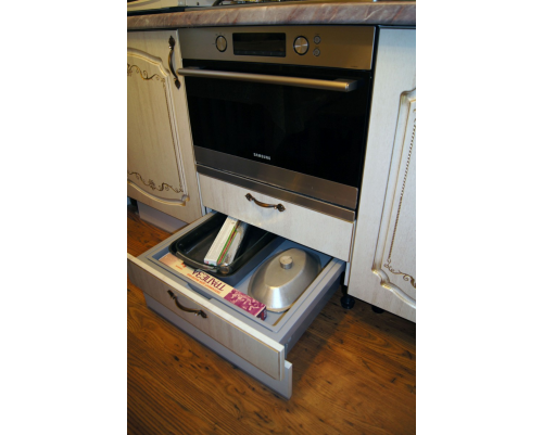 Поэтому под духовкой установлен полноценный глубокий орга-бокс (пластиковый ящик с доводчиком) использующий пространство цоколя.