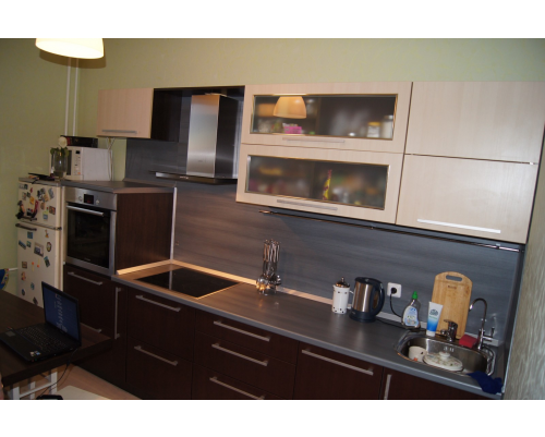 Очень популярное сочетание светлого верха и темного низа: в данной 3-метровой кухне они представлены дубом венге и беленым дубом. Фасады сделаны из МДФ, покрытой пластиком.Столешница 38 мм пластик, цвет Рива, стеновая панель такая же, закрывает пространство и за купольной вытяжкой в том числе. Между ними стковочный алюминиевый плинтус, который позволяет закрыть неровности стены, если таковые имеются